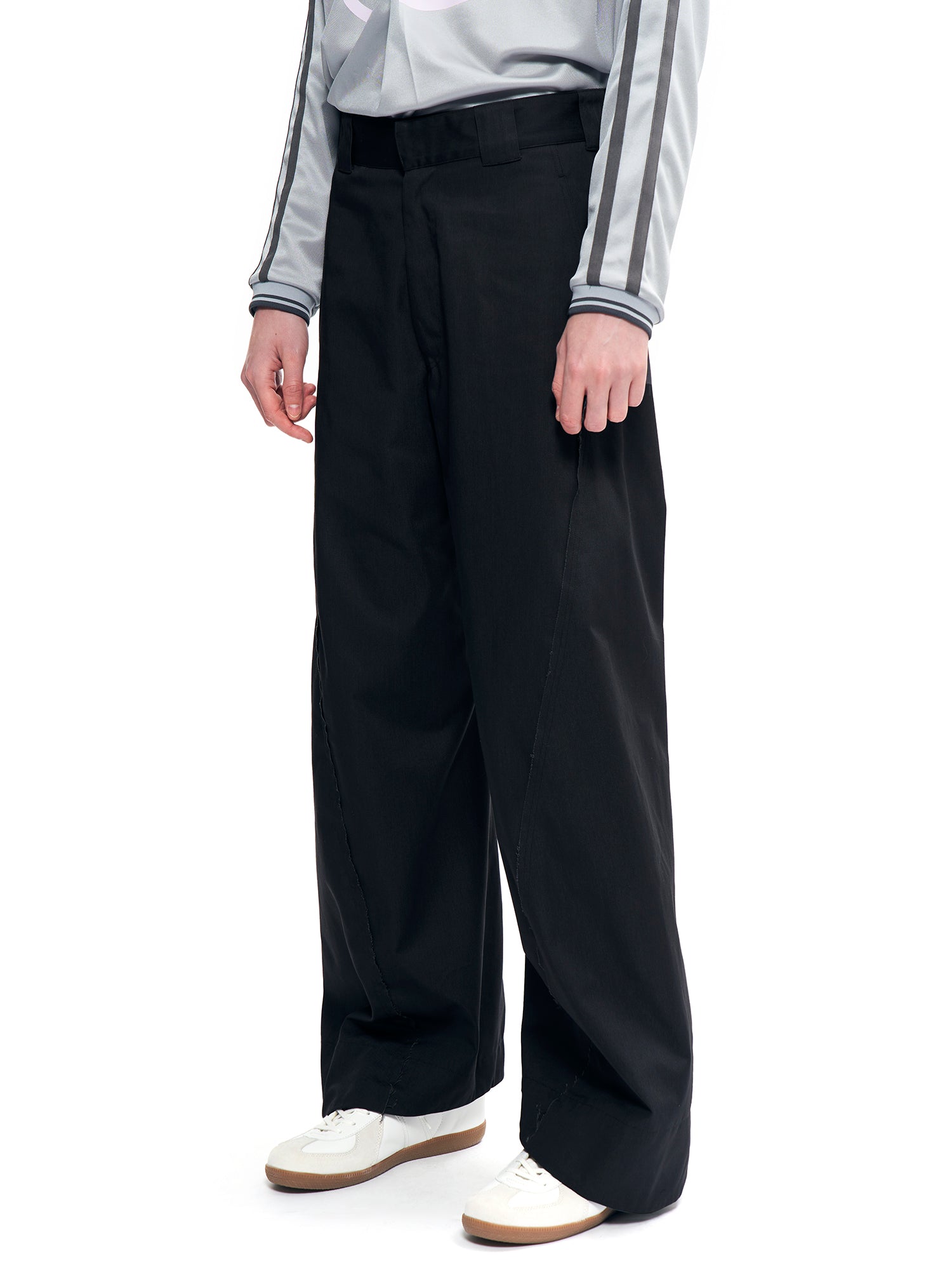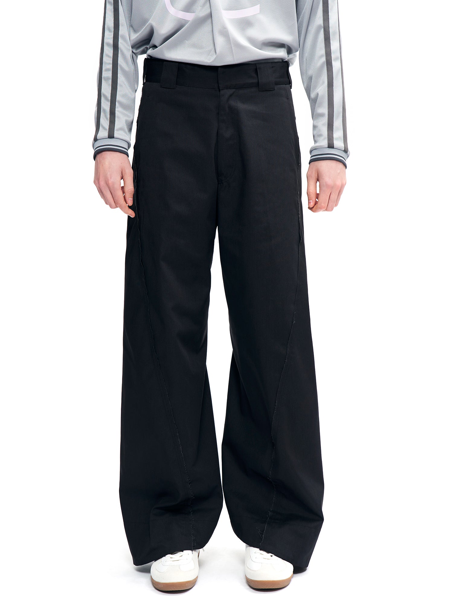 捩れをデザインに取り込んだ、立体的なシルエットのパンツ。